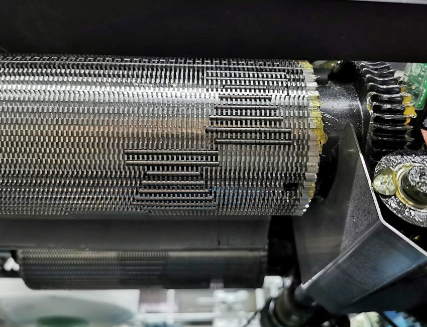 滾筒采用蝸輪蝸桿選針系統(tǒng),正反轉(zhuǎn)的新功能為手套編織時的選針提供了更多可能性,使織物的花型更加豐富。滾筒可以在任意位置實現(xiàn)超快速復位(速度是500 RPM),無需換高低針腳,可以實現(xiàn)橡筋一隔一,一隔二等自由切換。